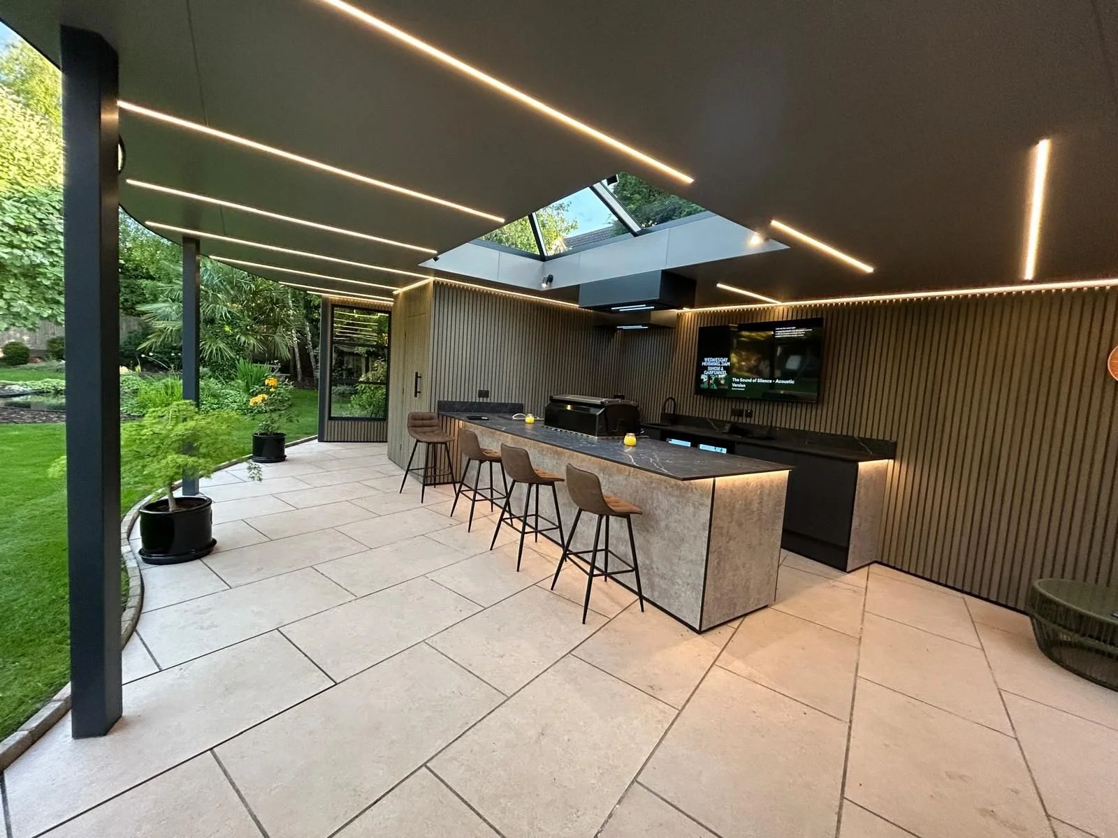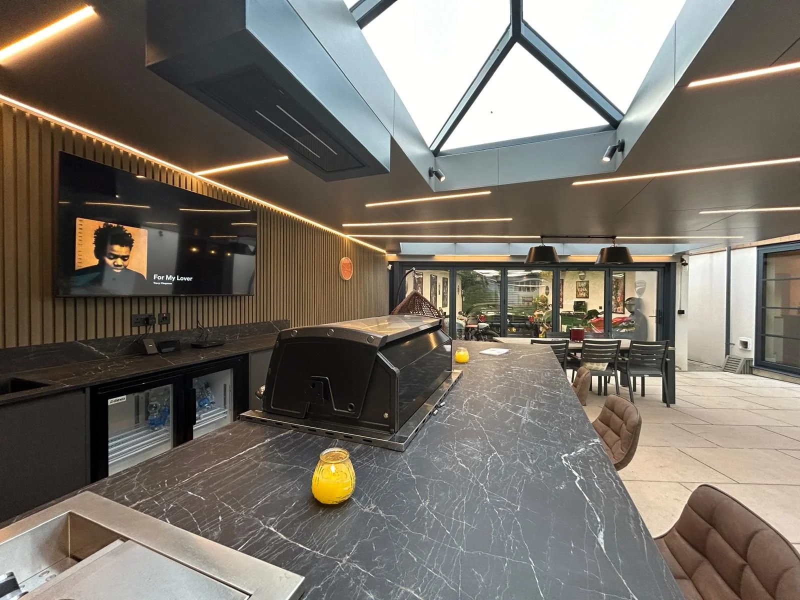 We had the pleasure of creating a master suite and kitchen extension with the added bonus of building this stunning garage accompanied with outside space that can be used all year round.